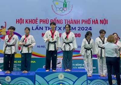 Em Vũ Đình Duy - lớp 10A4 xuất sắc đạt huy chương Vàng môn Taekwondo ở nội dung quyền biểu diễn đôi nam nữ tại Hội...